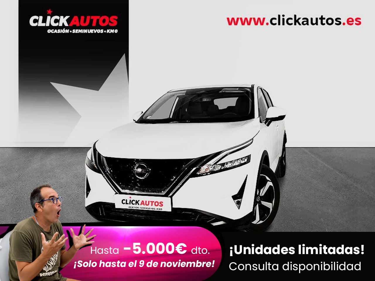 Acabado MHEV N-Connecta Xtronic. Disponible también en los colores White solido. También en Península y Baleares. Este anuncio es meramente informativo, no es vinculante ni contractual. Consulta a nuestros comerciales. Más de 2000 coches en stock permanente, visítenos en ClickAutos. - Alarma antirrobo perimetral Sistema de llamada de emergencia automática (E-CALL) Sistema automático de frenada predictiva de emergencia con detección de peatones y ciclistas Sistema de aviso de salida de carril Asiento del conductor reclinable y regulable en altura con ajuste lumbar electrónico Climatizador automático dual Espejo retrovisor interior antideslumbrante automático Levas para el accionamiento del cambio automático (CVT) situadas en el volante Llantas de aleación SENREN con corte diamantado de 46 cm (18′′) Faros delanteros y traseros Full LED Luz diurna de conducción LED Espejos retrovisores exteriores abatibles eléctricamente y calefactados Panel de instrumentación totalmente digital Full TFT de 31 cm (12 - 3′′) Pantalla de infoentretenimiento Nissan Connect de alta definición de 23 cm (9′′): Apple Carplay© inalámbrico y Android Auto©; Navegación por mapas Tom Tom; Actualización remota de mapas de navegación - Asistente de Amazon Alexa y Google Assist Sistema de conexión WIFI para dispositivos Cargador inalámbrico de smartphone Activación automática de las luces Sensor de lluvia automático Sensores de aparcamiento delanteros y traseros Cámara de aparcamiento de visión 360º con detección de objetos en movimiento Radio digital DAB Sistema de sonido de 6 altavoces Llave inteligente (apertura sin llave) Botón de encendido del motor Selector de modos de conducción (Eco - Normal - Sport) Tomas Tipo USB-A y USB-C en las plazas delanteras y traseras Freno de estacionamiento eléctrico + Asistente arranque en pendiente/Auto-hold Fijaciones ISOFIX en las plazas traseras Monitorización de la presión de los neumáticos Advertencia de colisión frontal predictiva Control de crucero inteligente con velocidad adaptada a las señales de tráfico Señal de parada de emergencia (Autohazard)